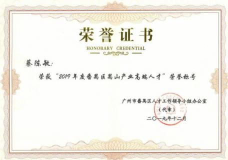 值得一提的是,蔡陳敏教授早在2019年,就是“廣州市番禺區禺山產業高端人才”榮譽稱號的獲得者。