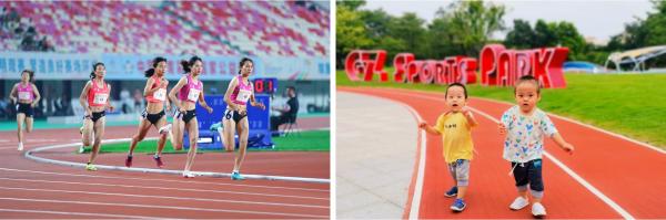 在廣州天河體育中心/廣州二沙島體育公園健身步道上奔跑的運(yùn)動(dòng)員和兒童